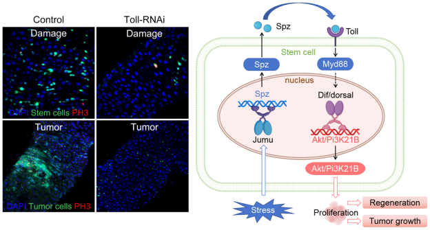 该研究不仅拓展了Toll信号通路的生物学功能认知,将其角色从经典的免疫调控延伸至干细胞生物学与组织稳态维持的核心领域,更为理解组织再生修复提供了崭新视角,系统阐明了应激状态下启动干细胞增殖的精细调控网络。同时,该研究揭示了一条在肠道肿瘤发生中此前未被重视的信号机制,为解析肿瘤异常增殖信号通路提供了新线索。